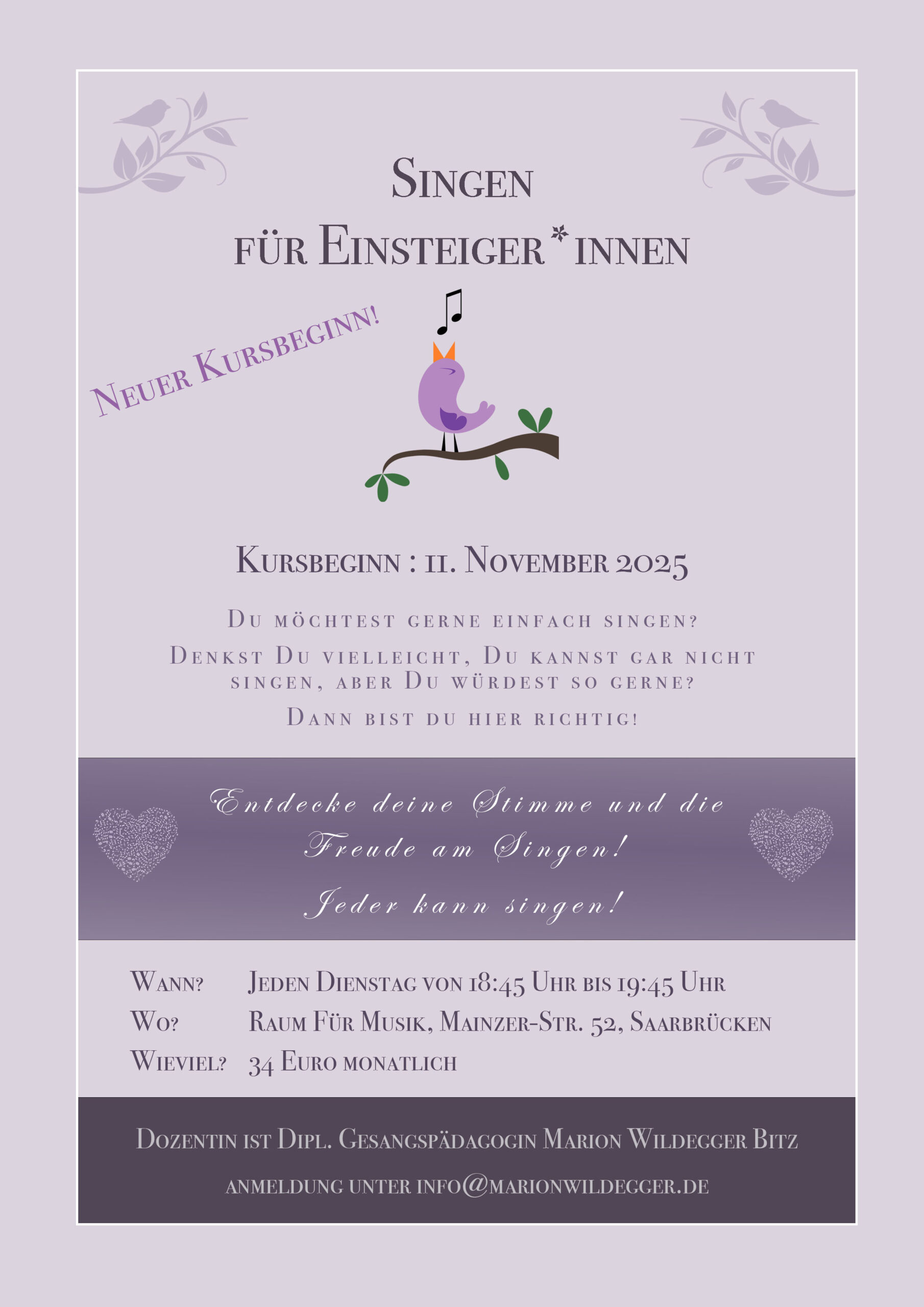 Stimmbildungskurse im Raum für Musik in der Mainzer Strasse 52 die Möglichkeit „einfach singen zu lernen.“